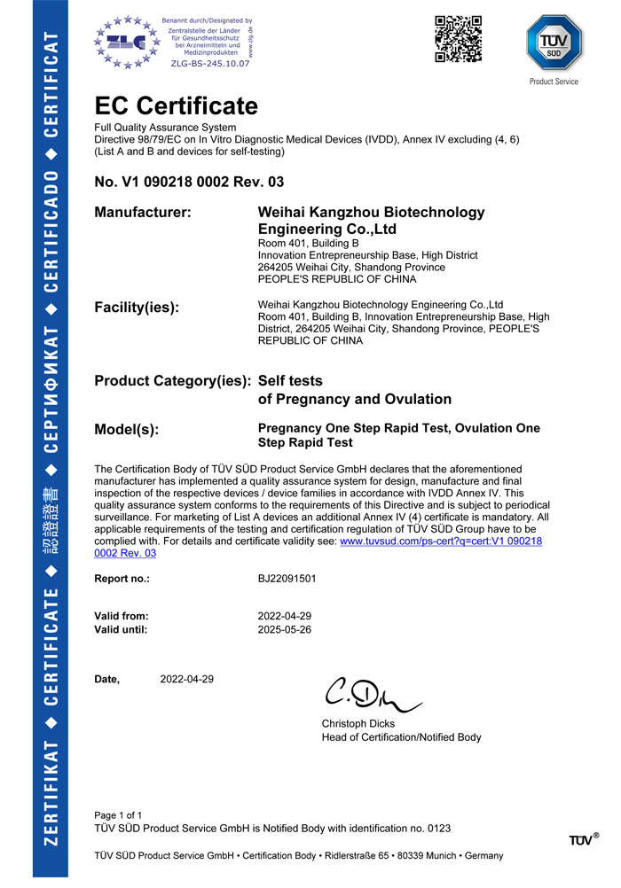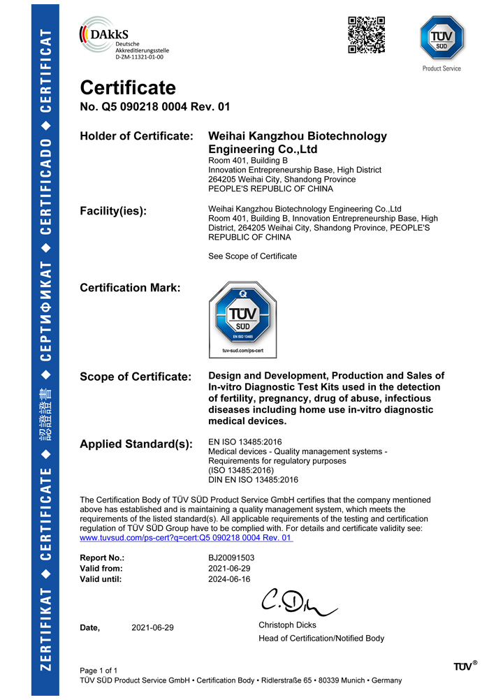 ? ? ?威海康州生物工程有限公司成立于2013年,公司坐落于風景秀麗的海濱小城——威海市??抵萆锸羌邪l、生產和銷售于一體的生物科技公司,與威海哈爾濱工業大學合作研發團隊,擁有先進的科研基地及生產基地。主要從事快速診斷檢測產品的研發、生產、銷售。產品涵蓋:生育檢測、藥物濫用檢測、農藥殘留檢測以及其他臨床診斷檢測等。公司自主研發生產得早早孕試紙,排卵檢測試紙,毒品檢測及疾病檢測等醫用產品,經過歐盟認證,產品質量穩定,值得信賴。